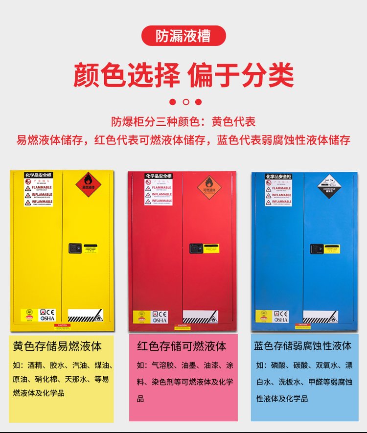防爆柜的種類如下:黃色防爆柜。存放一些易燃類的化學品,常見的有酒精等,這種是閃點較低的,在發生火災的時候需要優先處理。紅色防爆柜。存放一些可燃類的化學品,常見的有柴油、機油等,這種是閃點略低的,在發生火災的時候也需要格外注意。藍色防爆柜。存放一些弱腐蝕性液體的化學品,常見的有醋酸、磷酸等,這類腐蝕性略低,在發生火災的時候,也需要稍微注意。